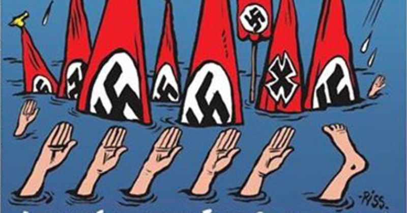 Напомним, на прошлой неделе издание выпустило в свет номер с очередной провокационной карикатурой. На ней нарисованы восемь флагов Третьего рейха - красных полотнищ, на которых в белом круге изображены черные свастики. Люди, которые их несут, скрыты потоком воды - от них на поверхности торчат лишь несколько рук и одна нога.