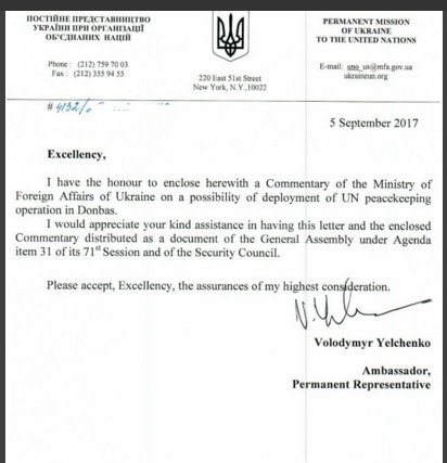Украина официально известила генерального секретаря ООН Антонио Гутерриша и председателя Совета Безопасности ООН о своей позиции относительно миротворческой миссии ООН в Донбассе.