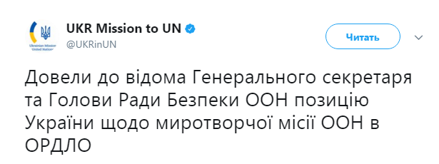 "Довели до сведения Генерального секретаря и Председателя Совета Безопасности ООН о позиции Украины относительно миротворческой миссии ООН в ОРДЛО", - подчеркивают в представительстве.