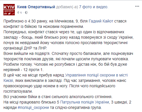 "Мужчина не растерялся и достал нож, потому что бой был очень неравный - 12 против 1", - говорится в сообщении "Киева оперативного".