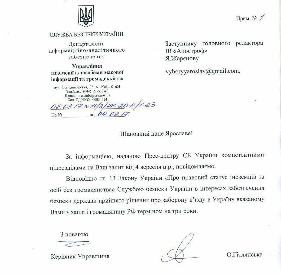 "Соответственно ст.13 Закону Украины "О правовом статусе иностранцев и лиц без гражданства" Службой безопасности Украины в интересах обеспечения безопасности государства принято решение о запрете въезда в Украину указанному Вами в запросе гражданину РФ сроком на три года", - говорится в решении СБУ.