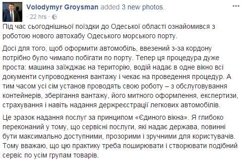 В Одессе накануне открылся административный центр, который работает по принципу единого окна для оформления авто, ввезенных из третьих стран. Так называемый автохаб работает на базе Морского порта Одессы. Фото с открытия автохаба выложил премьер-министр Владимир Гройсман на своей странице в Fаcebook.