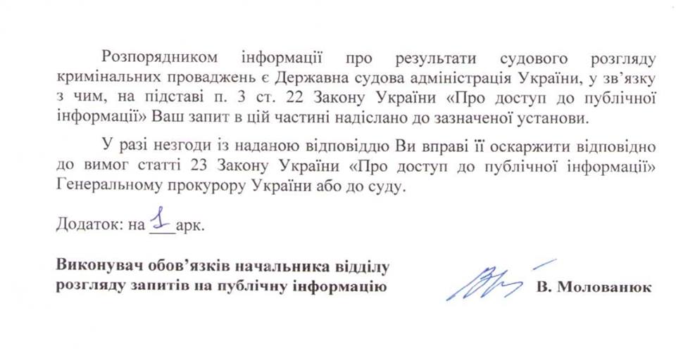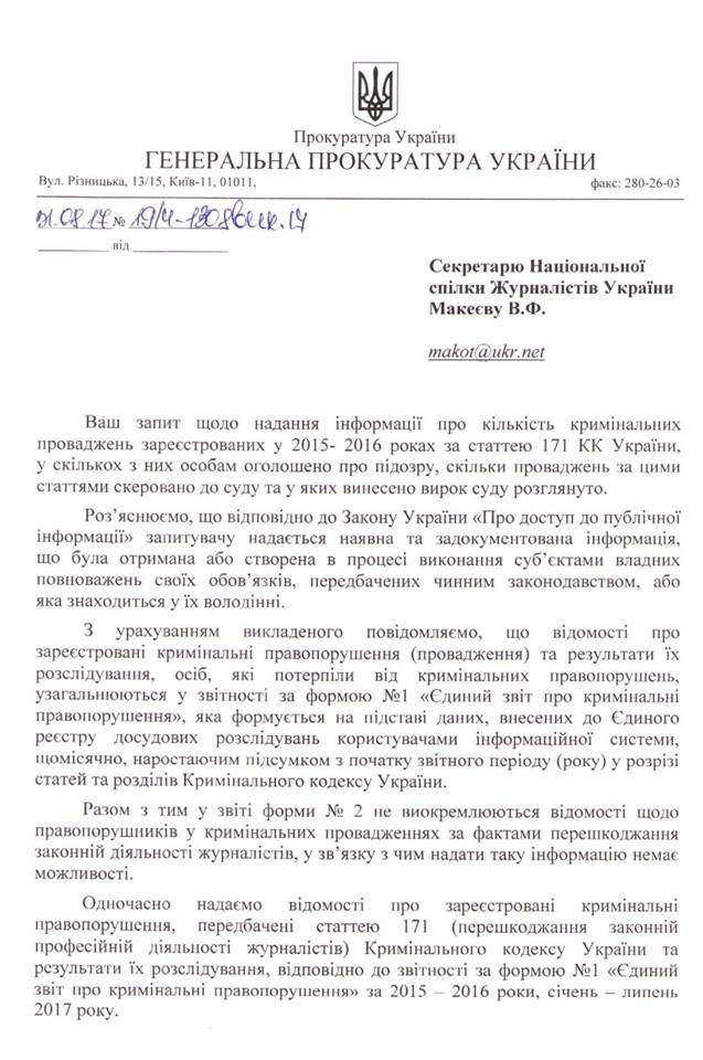 Как отмечает Валерий Макеев, Генпрокуратура сообщила, что не отслеживает результатов судебного разбирательства по результатам уголовных производств по ст. 171 УК. Следовательно, ответ НСЖУ стоит ждать от Государственной судебной информации Украины.