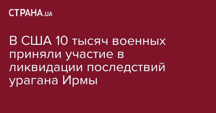 Около 10 тысяч военнослужащих приняли участие в ликвидации последствий урагана Ирма. Об этом говорится в заявлении представителя сухопутных сил ВС США Патрика Сейбера, пишут "РИА Новости".