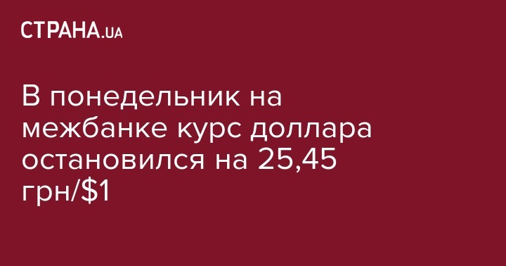 В понедельник, 18 апреля, на межбанковском валютном рынке курс валютной пары гривня-доллар практически не изменился по сравнению с завершением торгов в предыдущий рабочий день (25,46 грн/$1) и достиг уровня 25,45 грн/$1, передает "Интерфакс-Украина".