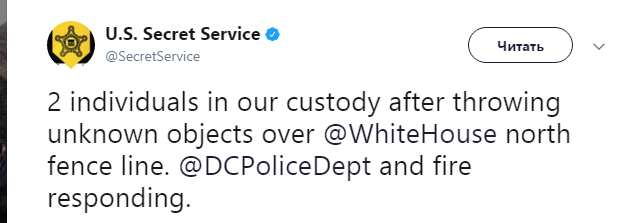 "Два человека взяты под арест после переброски ими неизвестных предметов через северную стену Белого дома", - говорится в сообщении.