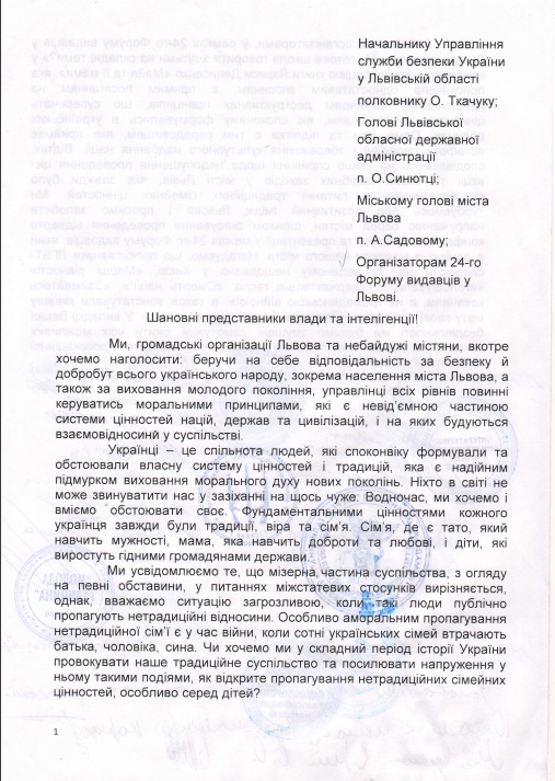 Письмо завершается прямой угрозой: "В случае Вашего бездействия мы будем вынуждены самостоятельно принять все возможные меры с целью недопущения проведения откровенно провокационной презентации во Львове".