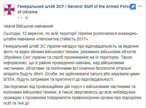 По всей территории Украины сегодня, 12 сентября, начались командно-штабные учения "Несокрушимая устойчивость-2017". Об этом сообщает Генеральный штаб ВС Украины в Facebook.