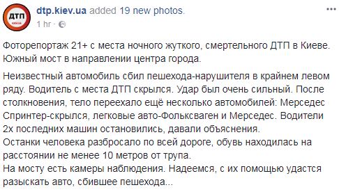"После столкновения, тело переехало еще несколько автомобилей: Мерседес Спринтер-скрылся, легковые авто-Фольксваген и Мерседес. Водители 2х последних машин остановились и дали объяснения, - сообщили в портале.