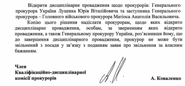 Квалификационно-дисциплинарная комиссия прокуроров начала против Генерального прокурора Юрия Луценко дисциплинарное производство. Об этом свидетельствует решение члена Квалификационно-дисциплинарной комиссии прокуроров Анатолия Коваленко, датированное 7 августа 2017, пишет "Украинская правда".