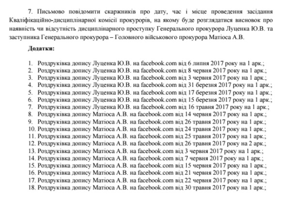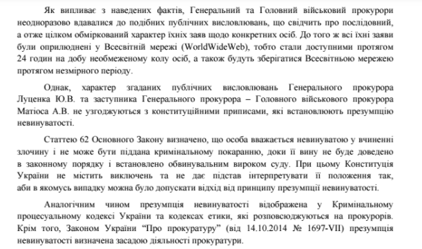 Согласно самой дисциплинарной жалобе, Луценко и Матиосу вменяются в вину публикация в социальных сетях сообщений, нарушающих презумпцию невиновности. В соответствии с Законом Украины "О прокуратуре" публичное высказывание, которое является нарушением презумпции невиновности, является основанием для привлечения прокурора к дисциплинарной ответственности.