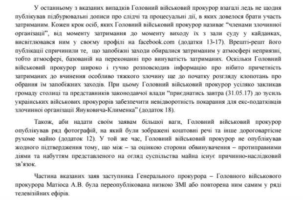 Также в дисциплинарной жалобе упоминаются посты Луценко от 31 марта 2017 года о взяточнике из коммунального предприятия (генпрокурор публикует фамилию и конкретную должность задержанного, характеризует последнего как "взяточника", а также добавляет фото), от 17 марта 2017 года по взятке военному прокурору (Луценко пишет фамилию и инициалы, а также должность задержанного, называя его "таможенником-взяточником").