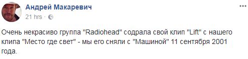 "Очень некрасиво группа "Radiohead "содрала свой клип" Lift "с нашего клипа" Место где свет "- мы его сняли с" Машиной "11 сентября 2001 года", - написал Макаревич в своем Facebook.