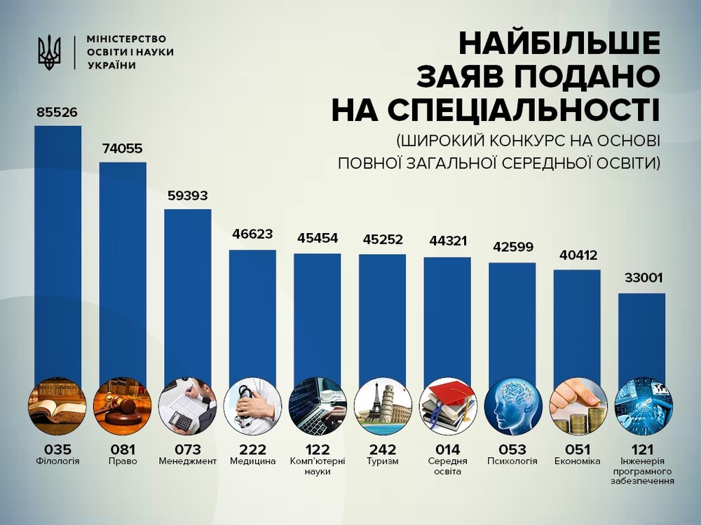 На филологию подали 85 тыс. 526 заявлений, на право - 74 тыс. 55 заявок, на менеджмент - 59 тыс. 393 заявок. Также среди лидеров – "Медицина", "Компьютерные науки", "Туризм", "Среднее образование", "Психология" и "Экономика" (от 40 тыс. до 46 тыс. заявлений). Замыкает Топ-10 "Инженерия программного обеспечения" – 33 тыс. заявлений.