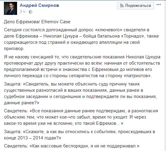"Сегодня состоялся долгожданный допрос "ключевого" свидетеля в деле Ефремова – Николая Цукура – бойца батальона "Торнадо", также содержащегося под стражей и ожидающего апелляции на свой приговор. Я не назову сенсацией то, что свидетельские показания Николая Цукура противоречат друг другу практически во всем: начиная от обстоятельств предполагаемой встречи и знакомства с Ефремовым до мотивов его личного перехода со стороны сепаратистов на сторону "патриотов", - написал Смирнов.