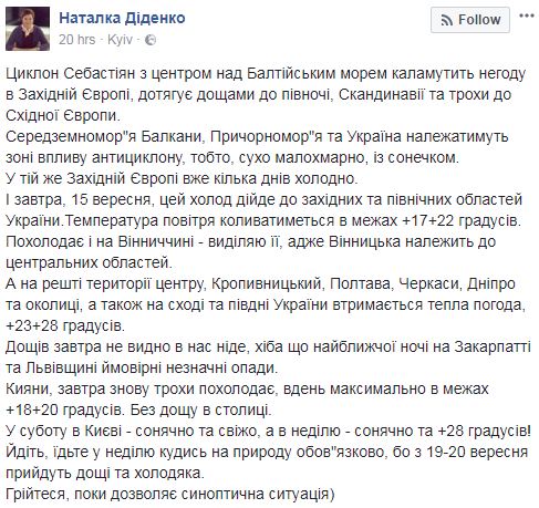 "А на остальной территории центра, Кропивницкий, Полтава, Черкассы, Днепр и окрестности, а также на востоке и юге Украины, удержится теплая погода, +23+28 градусов", – говорится в сообщении синоптика.
