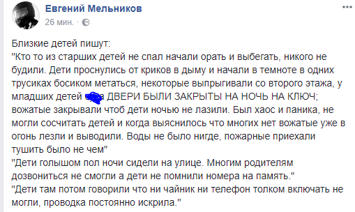 "Близкие детей пишут: "Кто то из старших детей не спал начали орать и выбегать, никого не будили. Дети проснулись от криков в дыму и начали в темноте в одних трусиках босиком метаться, некоторые выпрыгивали со второго этажа, у младших детей с@а ДВЕРИ БЫЛИ ЗАКРЫТЫ НА НОЧЬ НА КЛЮЧ; вожатые закрывали чтоб дети ночью не лазили. Был хаос и паника, не могли сосчитать детей и когда выяснилось что многих нет вожатые уже в огонь лезли и выводили. Воды не было нигде, пожарные приехали тушить было не чем".