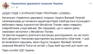 Начальник Государственной службы охраны Валерий Гелетей позвонил главному редактору "Радио Свобода" Инне Кузнецовой, чтобы извиниться перед журналистом Михаилом Ткачом за поведение своих сотрудников. Об этом сообщает пресс-служба ведомства.