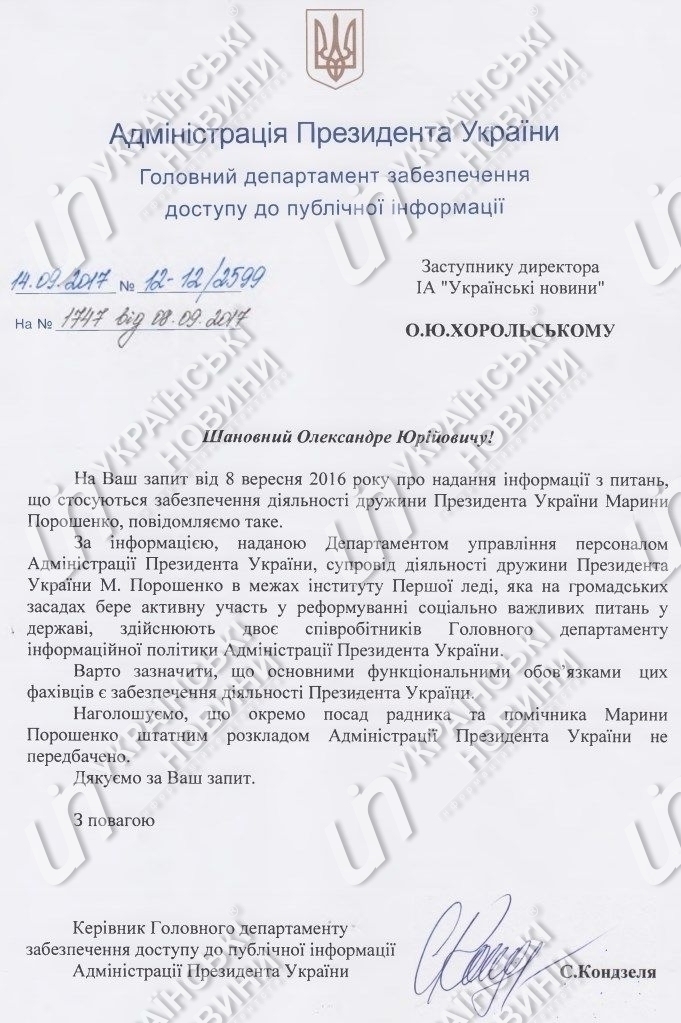 "По информации, предоставленной Департаментом управления персоналом АП, сопровождение деятельности супруги президента Украины М.Порошенко в рамках института Первой леди, которая на общественных началах берет активное участие в реформировании социально значимых вопросов в государстве, осуществляют двое сотрудников Главного департамента информационной политики", - говорится в ответе.