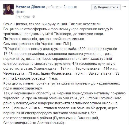 "Еще раз. Циклон – уже за пределами Украины. У нас максимум, что может быть – порывистый, до сильного, ветер в западных областях и на севере Украины", – подчеркнула синоптик.