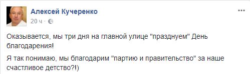 Алексей Кучеренко, экс-министр ЖКХ: "Оказывается, мы три дня на главной улице "празднуем" День благодарения! Я так понимаю, мы благодарим "партию и правительство" за наше счастливое детство?!)"