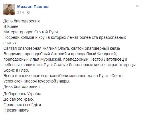 Так, политолог Михаил Павлив написал на своей странице: "День благодарения. В Киеве. Матери городов Святой Руси. Посреди холмов и круч в которых лежат более ста православных святых. Святая благоверная княгиня Ольга, святой благоверный князь Владимир, преподобный Антоний и преподобный Феодосий, преподобный Илья Муромский, преподобный Нестор Летописец и небесные защитники Руси Святые благоверные князья-страстотерпцы Борис и Глеб. Всего в тысяче шагов от колыбели монашества на Руси - Свято-Успенской Киево-Печерской Лавры. День благодарения...