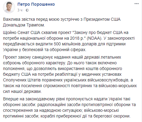 Петр Порошенко, который находится с визитом в Нью-Йорке, сообщил, что Сенат США принял проект закона о бюджете, который предусматривает выделение $ 500 млн на поддержку безопасности и обороны Украины. Об этом сообщается на Facebook-странице президента.