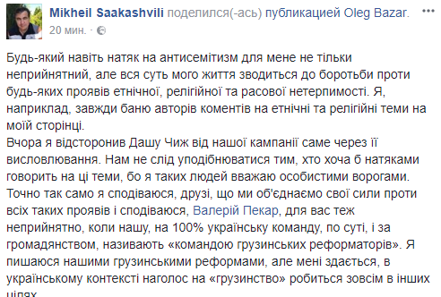 "Любой даже намек на антисемитизм для меня не только неприемлем, но вся суть моей жизни сводится к борьбе против всех проявлений этнической, религиозной и расовой нетерпимости. Я, например, всегда баню авторов комментов на этнические и религиозные темы на моей странице. Вчера я отстранил Дашу Чиж от нашей кампании именно по причине ее высказывания", - написал Саакашвили.