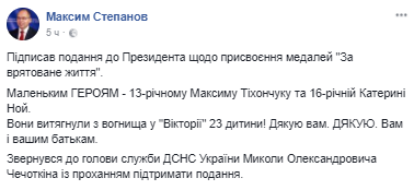 Он подписал представление президенту Украину Петру Порошенко о награждении 13-летнего Максима Тихончука и 16-летней Екатерины Ной медалями "За спасенную жизнь". Подростки также были в ночь пожара в детском лагере и вынесли на своих руках из огня 23 ребенка.