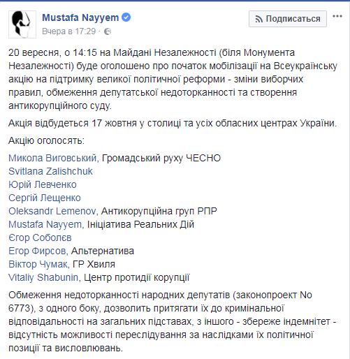 "20 сентября в 14:15 на Майдане Незавимисоти (около Монумента Независимости) будет провозглашено начало мобилизации на Всеукраинскую акцию в поддержку большой политической реформы — изменения избирательных правил, ограничения депутатской неприкосновенности и создания антикоррупционного суда. Акция пройдет 17 октября в столице и всех областных центрах Украины", - написал бывший журналист.