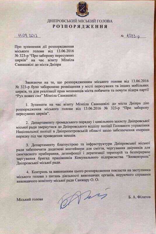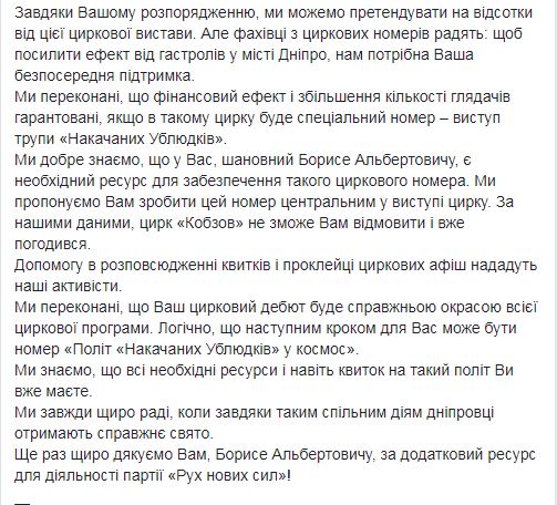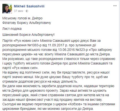 "Благодаря Вашему распоряжению, мы можем претендовать на проценты от этого циркового представления. Но специалисты из цирковых номеров советуют: чтобы усилить эффект от гастролей в городе Днепр, нам нужна Ваша непосредственная поддержка. Мы убеждены, что финансовый эффект и увеличение количества зрителей гарантированы, если в таком цирке будет специальный номер - выступление труппы "Накачанные ублюдки", - написал Саакашвили в своем Facebook.