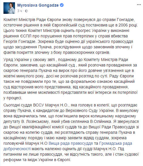 "Правительство Украины в своем отчете, поданном в Комитет Министров Совета Европы, замолчало, что кассационный суд, который начал производство по жалобе генерала Пукача на приговор о его пожизненном заключении еще в октябре прошлого года, до сих пор не начал рассмотрение по существу. Совет Европы также не уведомили о том, что по формальному признаку кассационный суд отстранил моего представителя от кассационного производства, лишив меня возможности представлять мои интересы как потерпевшей в процессе ", - написала Гонгадзе.