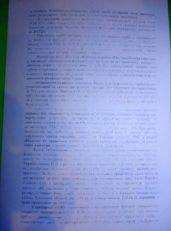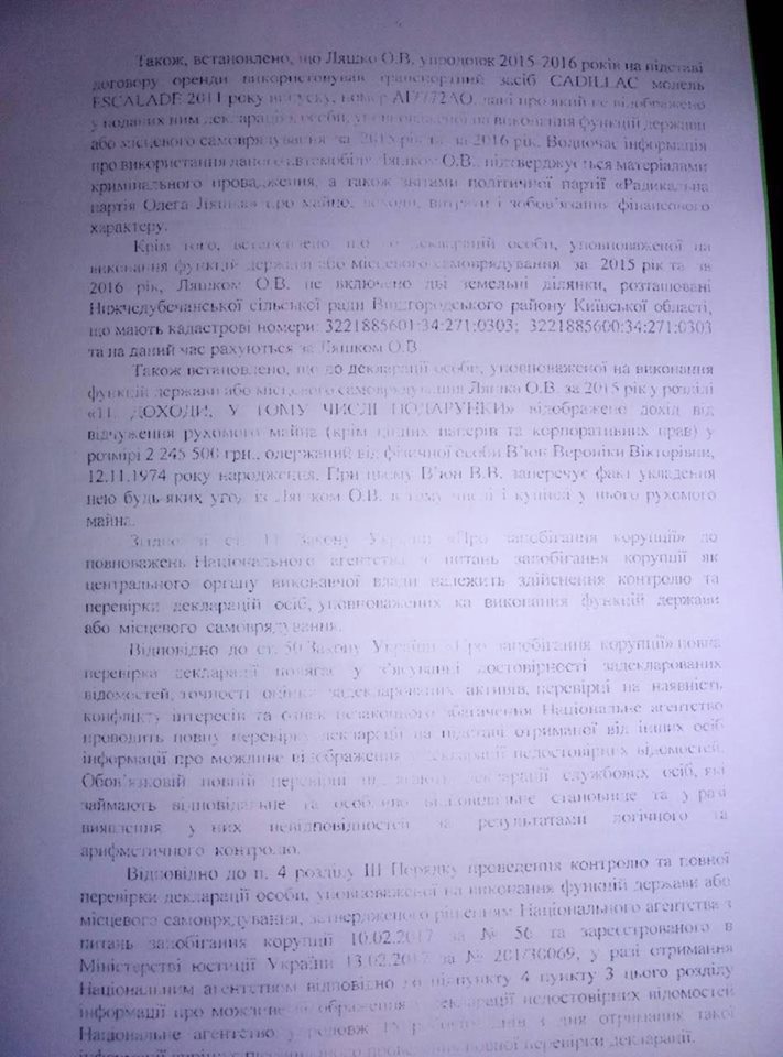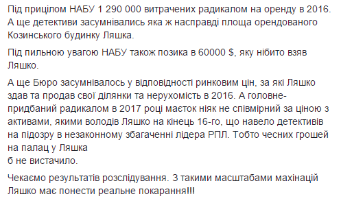"Сотрудники бюро изучили декларации радикала 2015 и 2016 годы и нашли множество нарушений, начиная от сроков подачи к несоответствий и недостоверных фактов. В 15-м Ляшко задекларировал, что прекратил право собственности на три объекта недвижимости, при этом никаких сделок не осуществил. Далее указал 87 000 грн на содержание нежилых помещений, которые в предыдущей декларации не было. Также без всякого документального подтверждения и отражения в разделе о сделках у Ляшко появились данные  об аренде дом и земли в Козине. Вообще интересные вещи произошли с земельными участками в Княжичах: с 210 кв. м в 2015-м они в 2016 разрослись до 2100 квадратных метров. Загадочно исчез из декларации гараж в Прилуках и Мерседес. Данных ни о продаже, ни о других операциях с ними нет. Плюс, в одной декларации нет арендованного Ляшко Кадиллака, который при этом  появляется  в отчете партии", - написал Каплин.