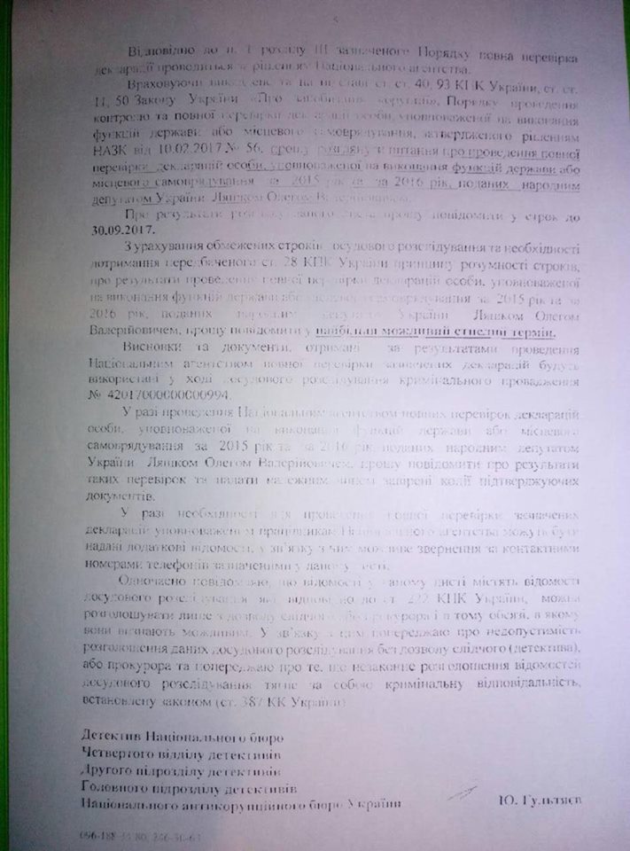 Народный депутат Сергей Каплин заявил, что НАБУ установило факт незаконного обогащения Ляшко. Об этом Каплин написал в своем Facebook и приложил скан-копии документов.