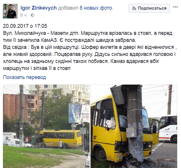 Во Львове КамАз врезался маршрутку и буквально впихнул ее в столб.