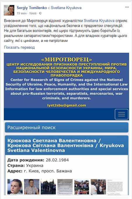 "Внесение на Миротворец известной журналистки Светланы Крюковой способствует осознанию того, что национальная безопасность является предметом спекуляций. Не для многих волонтеров, которые искренне поддерживают идею борьбы с реальными сепаратистами / террористами. А для властных кураторов этого сайта, которые являются циниками, а не патриотами", - заявил Томиленко.