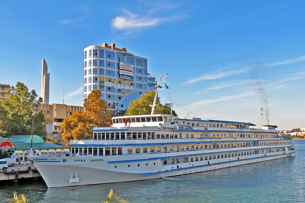 Круизный теплоход типа река-море "Зирка Днепра" в настоящее время движется в направлении Крыма.