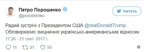 18:07  Судя по времени публикации, Петр Порошенко писал этот твит прямо на встрече с Трампом.