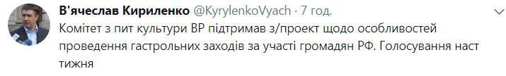 "Комитет по вопросам культуры ВР поддержал законопроект относительно особенностей проведения гастрольных мероприятий с участием граждан РФ", - говорится в сообщении.