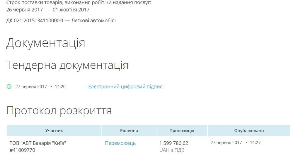 Тендерная документация компании, обнародована в системе публичных закупок ProZorro. Согласно документов, предусматривается, что крайний срок поставки автомобиля - 1 октября 2017 года.