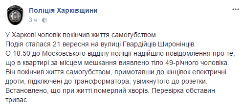 В Харькове 49-летний мужчина покончил жизнь самоубийством. Об этом сообщают в отделе коммуникации Нацполиции Харьковской области в Fаcebook.