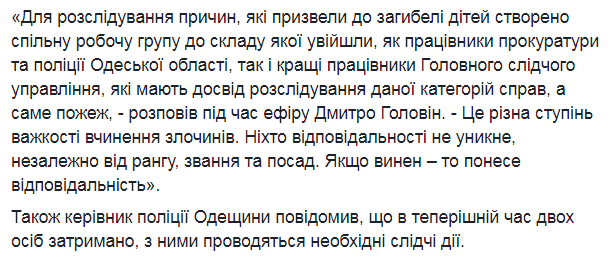 Как сообщалось, 17 сентября было начато досудебные расследование по ч. 2 ст. 270 (нарушение требований пожарной безопасности, повлекшее гибель детей) и ч. 2 ст. 367 (служебная халатность) Уголовного кодекса Украины.