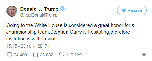 "Приглашение в Белый дом - это огромная честь для команды-чемпиона. Стефен Карри сомневается, поэтому приглашение отозвано", - написал американский лидер.