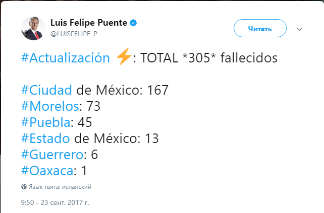 "Обновление: всего 305 погибших. В Мехико - 167, в штате Морелос - 73, в штате Пуэбла - 45, в штате Мехико - 13, в штате Герреро - 6, в штате Оахака - 1", - сообщил Пуэнте.