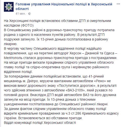 Отмечается, что на пересечении автодорог Херсон - Джанкой и Одесса - Мелитополь водитель грузового автомобиля Renault не уступил дорогу "ВАЗ-2109", в результате чего произошло столкновение транспортных средств. Ехавшая в легковушке семейная пара погибла на месте, их 13-летняя дочь была госпитализирована.