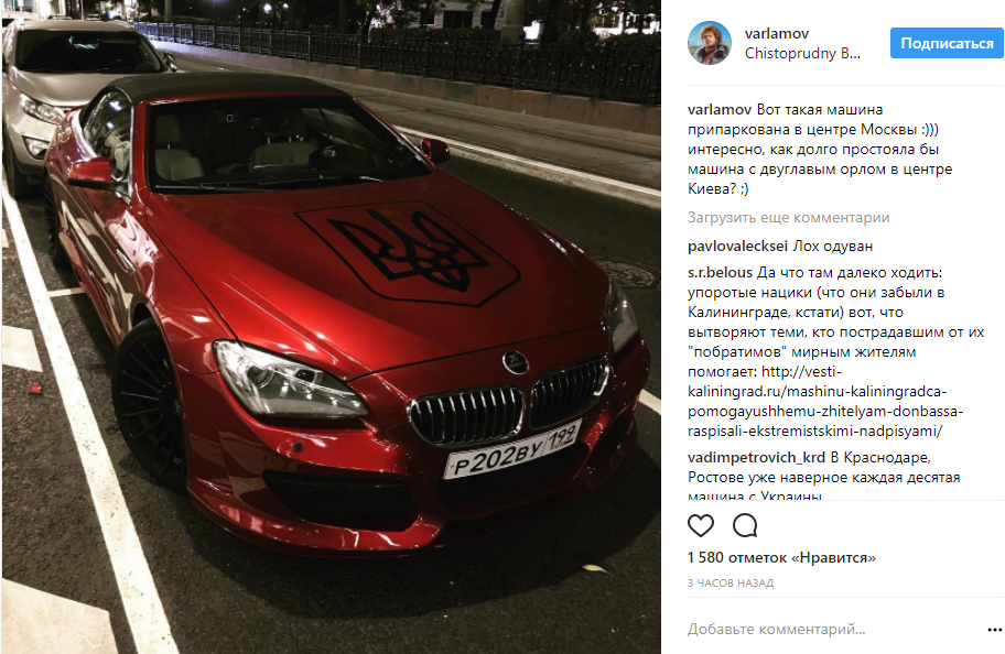 Сегодня, 25 сентября, в центре Москвы очевидцы засняли припаркованную у обочины иномарку ярко-красного цвета с российскими номерами и украинским гербом на капоте. Фото с необычной для дорог России аэрографией разместил у себя в Instagram известный блогер Илья Варламов.