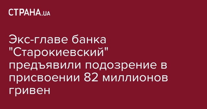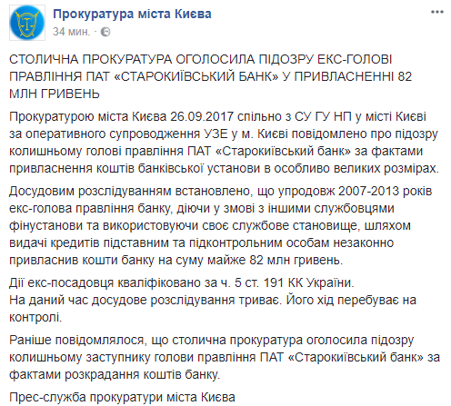 Во вторник, 26 сентября, прокуратура Киева объявила подозрение бывшему председателю правления "Старокиевский банк" о присвоении 82 млн грн. Об этом сообщается на странице ведомства в Facebook.