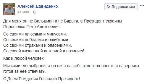 Алексей Давиденко, чиновник КГГА: "Для меня он не Вальцман и не Барыга, а Президент Украины Порошенко Петр Алексеевич. Со своими плюсами и минусами. Со своими победами и ошибками. Со своими страхами и опасениями. Со своей жизненной историей и позицией. Как и любой человек. Мы сами его выбрали, а он взял на себя ответственность и наверняка готов за неё отвечать. С Днём Рождения Господин Президент!"