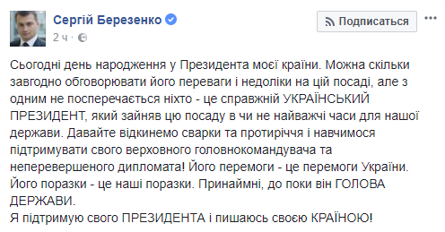 Сергей Березенко, депутат: "Сегодня день рождения у Президента моей страны. Можно сколько угодно обсуждать его достоинства и недостатки в этой должности, но с одним не поспорит никто - это настоящий УКРАИНСКИЙ ПРЕЗИДЕНТ, который занял эту должность в едва ли не самые трудные времена для нашего государства. Давайте отбросим ссоры и противоречия и научимся поддерживать своего верховного главнокомандующего и непревзойденного дипломата! Его победы - это победы Украины. Его поражения - это наши поражения. По крайней мере, пока он Глава государства. Я поддерживаю своего ПРЕЗИДЕНТА и горжусь своей страной!"