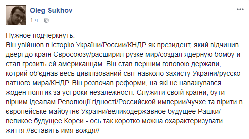Олег Сухов, журналист: "Нужное подчеркнуть. Він увійшов в історію України/России/КНДР як президент, який відчинив двері до країн Євросоюзу/расширил рузке мир/создал ядерную бомбу и стал грозить ей американцам. Він став першим головою держави, котрий об'єднав весь цивілізований світ навколо захисту України/русско-ватного мира/КНДР. Він розпочав реформи, на які не наважувався жоден політик за усі роки незалежності. Служити своїй країни, бути вірним ідеалам Революції гідності/Российской империи/чучхе та вірити в європейське майбутнє України/великодержавное будущее Рашки/великое будущее Кореи - ось так коротко можна охарактеризувати життя //вставить имя вождя//"